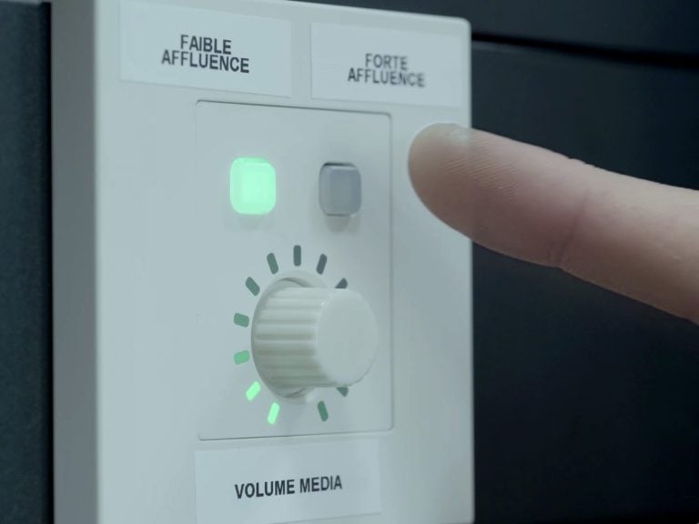 Nous utilisons également des enceintes colonnes à directivité contrôlée, garantissant une excellente portée sonore et une intelligibilité optimale de la parole.